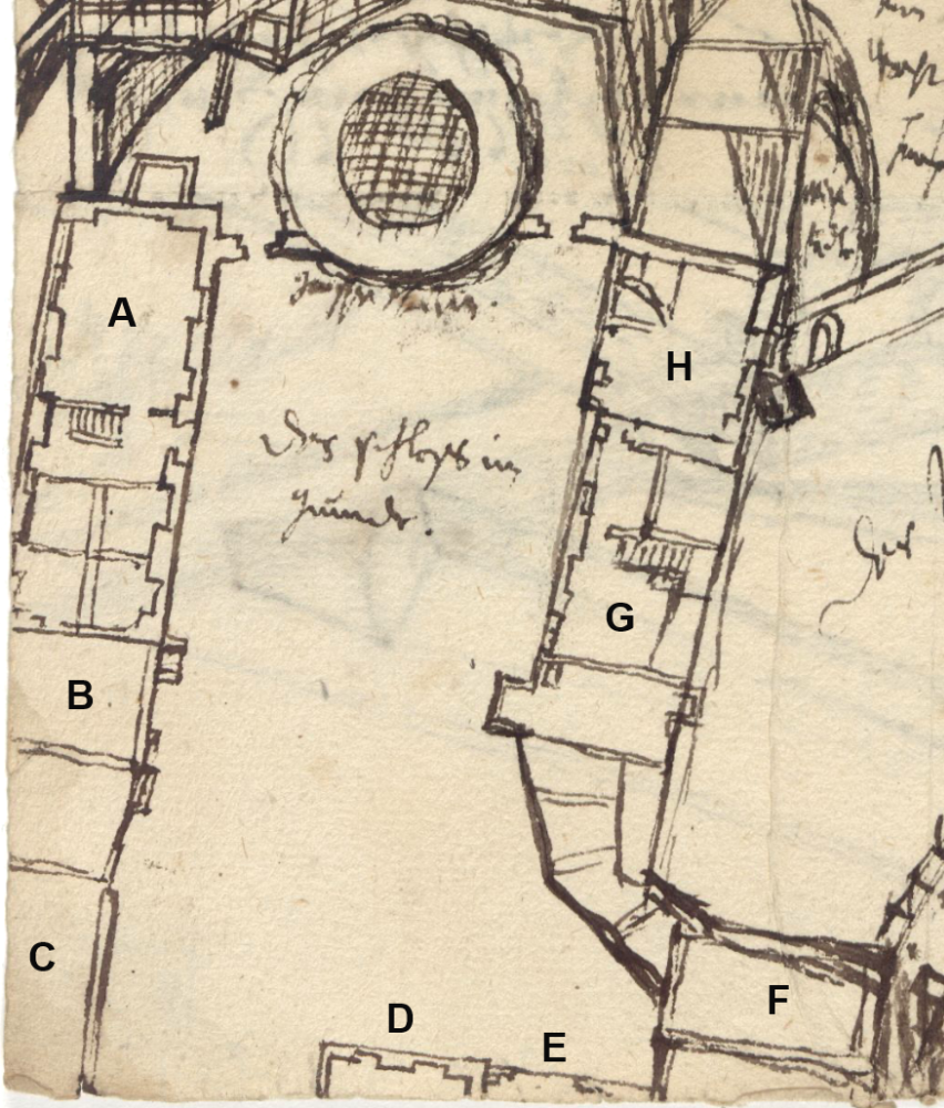 Bild: Grundriss der Gebäude um den inneren Schlosshof. Zeichnung des Landgrafen Moritz von 1624 (2 Ms. Hass. 107, 281 recto), A: Alter Herrenbau, B: Mittelbau, C: Marstall, D: Sakristei, E: Kapelle (Chor), F: Mitteltor, G: Neuer Herrenbau (Diele mit Treppe ins Obergeschoss), H: Küche).